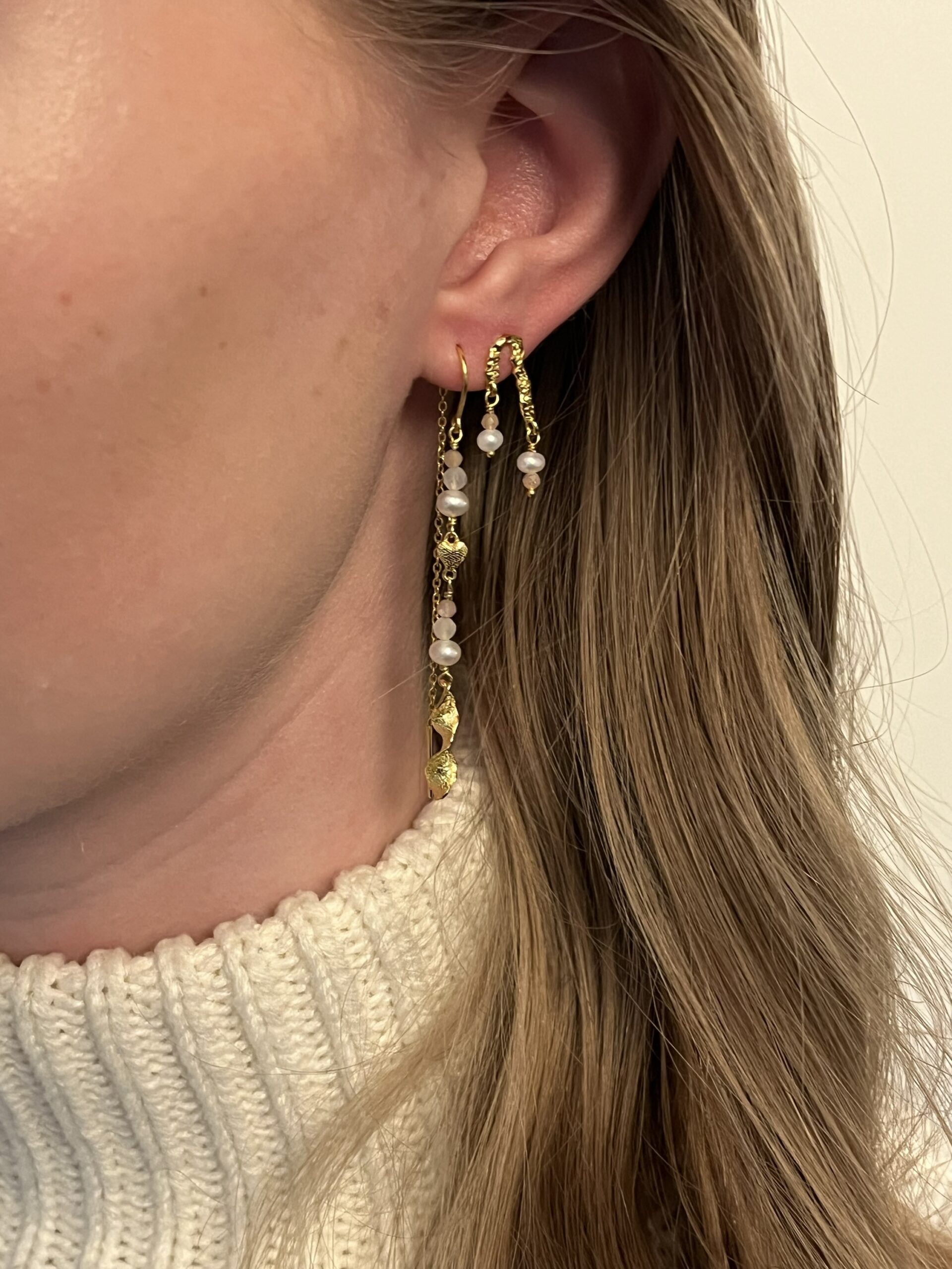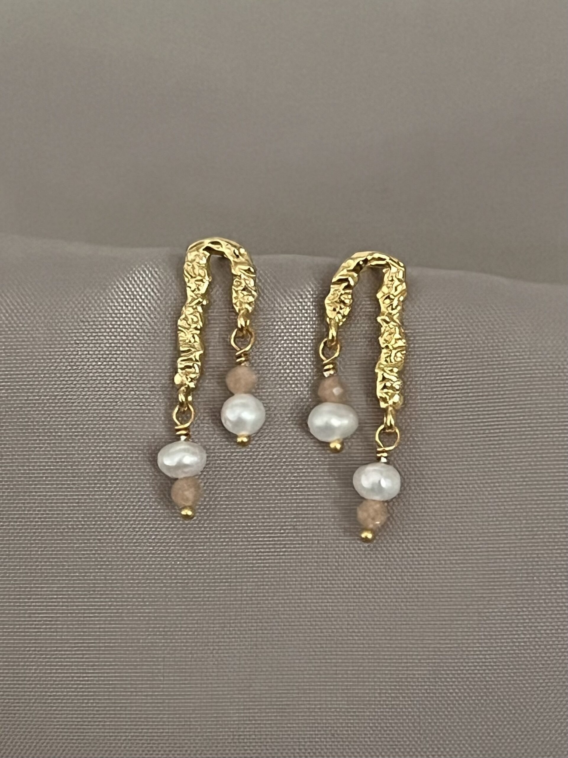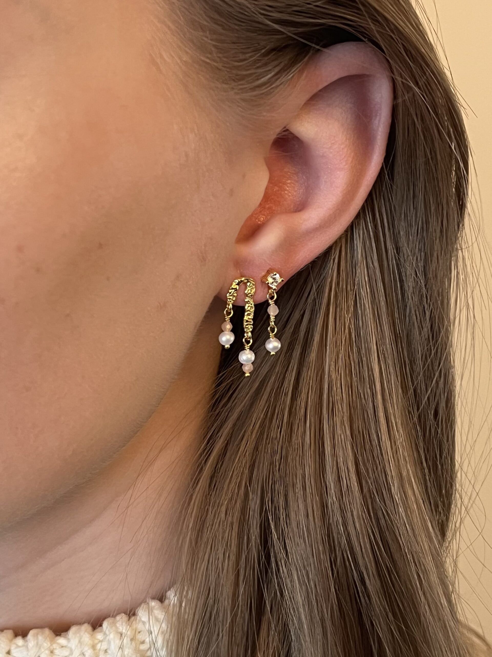 De smukke Cora øreringe med ferskvandsperler og små Peach moonstones